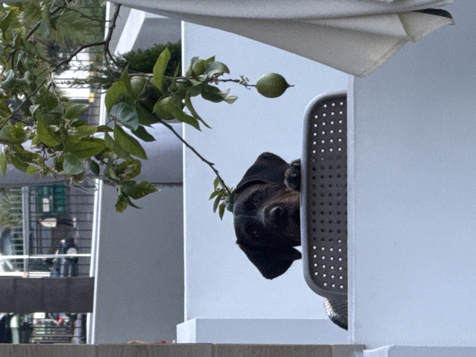 The image displays a street scene from the perspective of a balcony or terrace in Funchal, Portugal. In the midground, a dark-furred dog's head and front paws are visible, resting on the top of a grey, perforated outdoor chair. The dog is looking directly towards the viewer. To the immediate right of the dog, a branch from a citrus tree, laden with green leaves and a single green, teardrop-shaped fruit, extends downwards. Further to the right, a section of a light-colored fabric, possibly an umbrella or canopy, is partially visible. The foreground features a white balcony wall. In the background, beyond the white wall, an urban street is visible, featuring a partial view of a dark vehicle on the left, and a person wearing a light-colored jacket standing behind a black metal fence. Additional green foliage and distant structures are present in the blurred background. The scene is illuminated by soft, ambient light.
