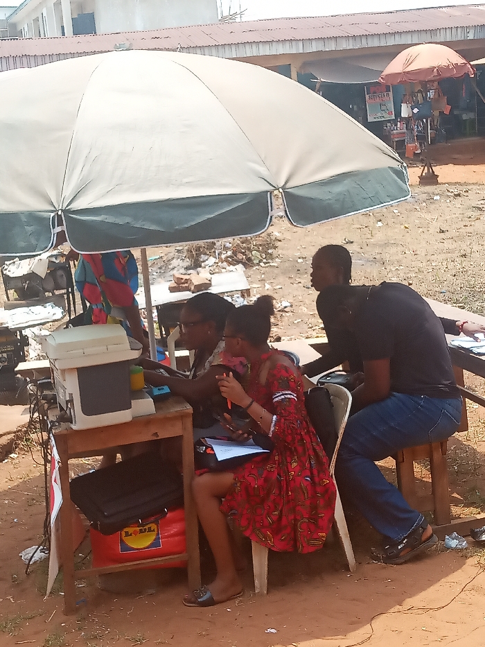 The image depicts an outdoor scene in Nsugbe, Nigeria, under bright daylight. A large, beige and dark green market umbrella provides shade over a makeshift service point. Three individuals are actively engaged around a small, light brown wooden table. A woman positioned center-left, wearing glasses and a light-colored patterned blouse, is seated and operating a light-colored electronic device resembling a printer or scanner. Wires extend from this device. Adjacent to her, a second woman, seated on a white plastic chair, wears glasses and a red patterned dress. She holds a red pen in her right hand, looking down at documents or a portable device on her lap. To the right, a man wearing a black t-shirt and blue jeans sits on a wooden stool, leaning forward, observing the activity on the table. He wears dark sandals. Beneath the wooden table, a black briefcase or laptop bag rests next to a red shopping bag with the "LIDL" logo. The ground is uneven, reddish-brown dirt. In the background, various structures with corrugated metal roofs are visible, including other market stalls. A smaller, orange market umbrella is seen further back. A large white building is partially visible in the far background. A partial sign in the mid-background reads "SERVICES IS..."
