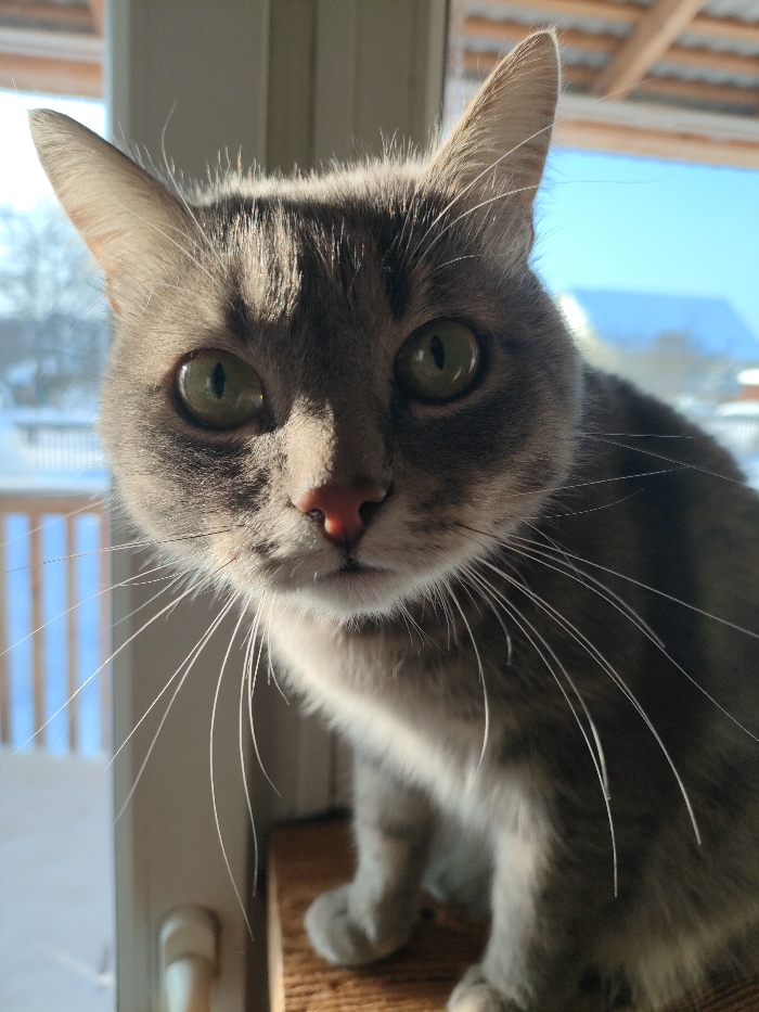 A gray tabby cat with striking green eyes gazes directly at the viewer. The sun illuminates the left side of its face, creating a distinct shadow on the right. Its long, white whiskers stand out against the gray fur. The cat is positioned near a window, through which a snowy landscape and blue sky are visible. The cat appears to be sitting on a wooden window sill.