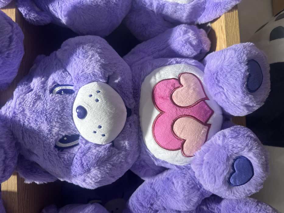 - "A large, light purple plush toy, resembling a Care Bear, is depicted sitting upright on a light-colored wooden shelf" by FM-2jCks2, licensed under CC BY 4.0