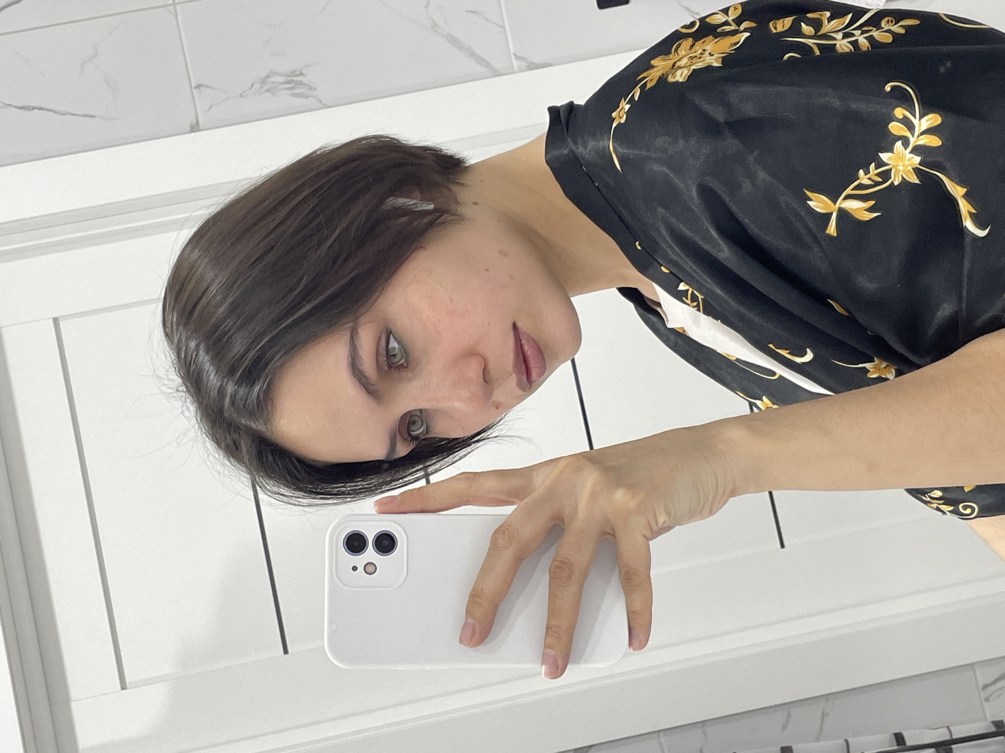 A female individual with short, dark brown hair and green eyes is depicted from the chest up, captured in a mirror selfie. She holds a white smartphone, featuring a dual-camera system, with her right hand, positioning it to reflect her image. Her gaze is directed towards the phone. She wears a black, satin-like robe or jacket with a prominent gold floral and leaf pattern, layered over a white inner garment. A white wireless earbud is visible in her right ear. The background visible in the reflection consists of a white paneled door to the left and white wall tiles with a grey marble-like vein pattern to the right, indicative of an indoor domestic setting such as a bathroom. There are no discernible features within the image to specify the location as Izhevsk, Russia.