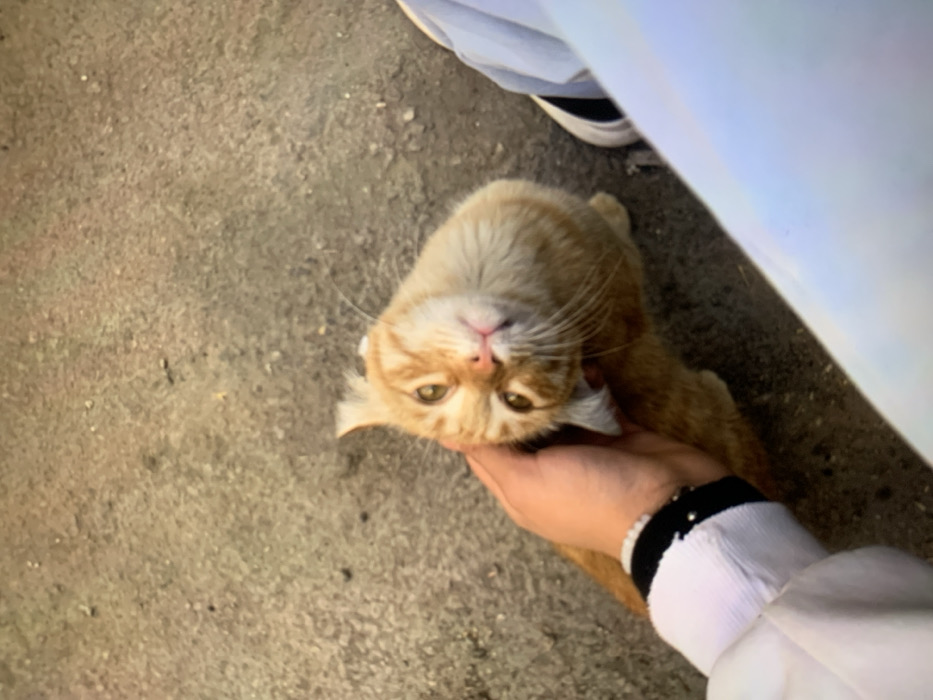 - "An orange tabby cat is being petted by a person wearing a white long-sleeved shirt with a black and white bracelet" by FM-q7EDs2, licensed under CC BY 4.0