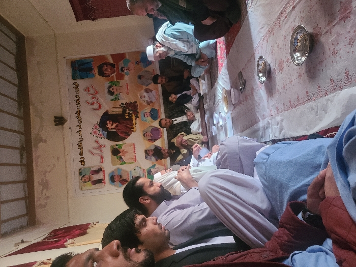 An indoor gathering in Quetta City Tehsil, Pakistan, depicts approximately 13-15 males, including one young boy, seated on a floor covered by a patterned red rug and a white plastic sheet