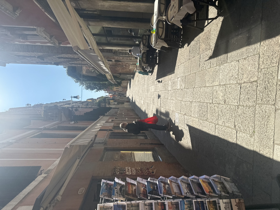 The image depicts a narrow paved calle (street) in Venice, Italy, under bright sunlight. The calle extends into the distance, flanked by multi-story historic buildings with reddish-brown facades. On the left side, a building with a number "153" above its ground-floor shopfront features a white awning. Adjacent to the shop entrance, a black metal rotating rack displays numerous postcards. Further left, below the awning, various souvenir items, possibly masks or small bags, hang for sale. A person, appearing to be an adult female with light-colored hair, stands mid-frame on the left, facing right. She wears dark clothing and holds a bright red bag in her left hand, casting a long shadow on the stone pavement. On the right side of the calle, another building, also with a white awning, houses an outdoor dining area. Several square tables are arranged with white tablecloths and two chairs per table. One table in the mid-ground is occupied by an individual, likely male, wearing a light-colored shirt, seated with their back partially to the camera, looking right. Another person is partially visible seated further back. A blue stroller or cart is positioned near the furthest tables on the right. Two pigeons are present on the grey stone pavement: one in the mid-ground between the standing person and the dining tables, and another further back. The bright sun from the upper right casts strong, defined shadows across the calle and from the buildings, illuminating the scene. A street lamp extends from the building on the right, mid-distance. The sky above the calle is clear and blue.