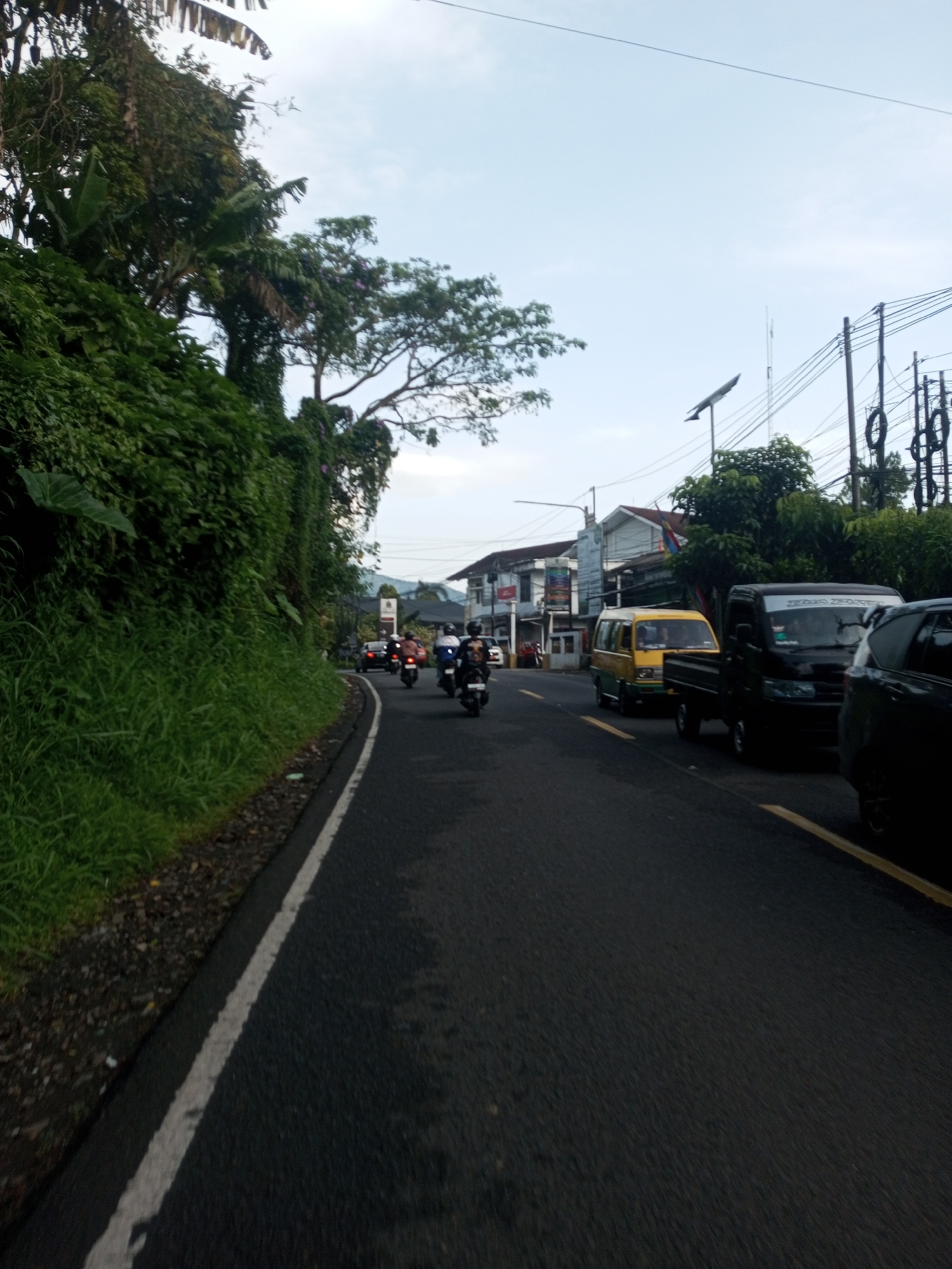 The image depicts a street scene in Mya Sit Kaing Ywar Thit, Myanmar. The road is asphalt with a white line marking the edge on the left and a yellow line dividing lanes on the right. Several motorcycles are traveling along the road. A yellow mini-van and a black truck are visible, parked along the right side of the road. A dark SUV is parked further down the road on the right. Buildings are visible along the roadside, some appearing to be shops. Power lines and poles are visible above. Lush green vegetation covers the embankment on the left side of the road. The sky is overcast.