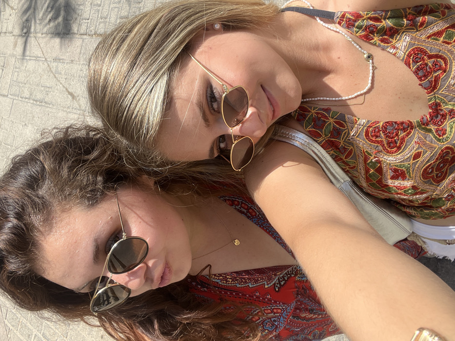 Two young women pose for a selfie. One has wavy, brown hair and wears a red patterned top with gold-rimmed sunglasses and a delicate gold necklace. The other has straight, blonde hair and wears a patterned top, a pearl necklace, and gold-rimmed sunglasses. Part of a silver bag strap is visible. They both appear relaxed and enjoy a sunny day. The ground is made of light-colored pavement stones.