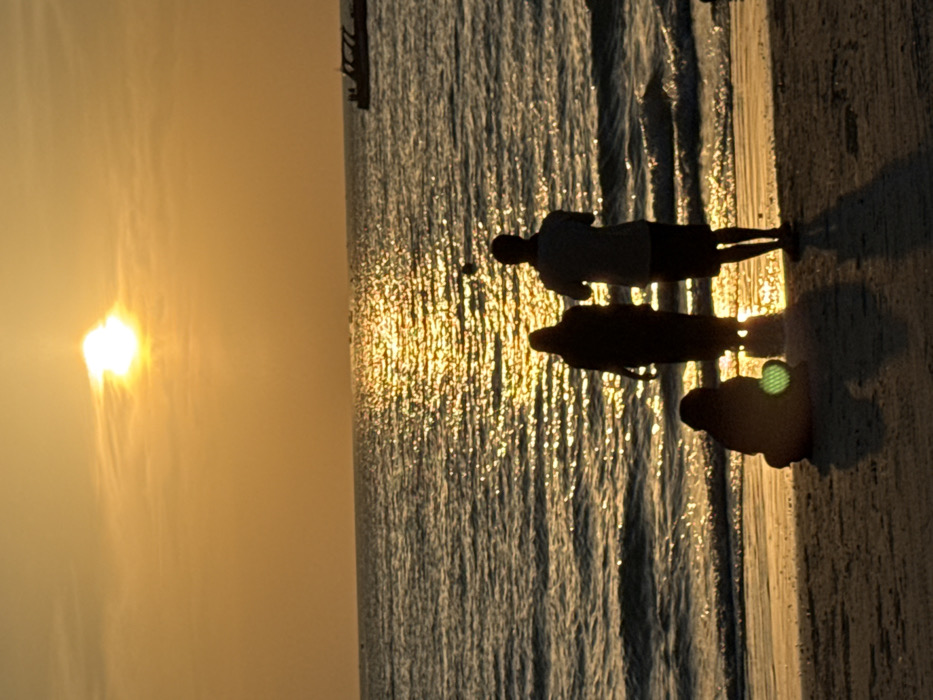 The image depicts a sunset scene at Cenang Beach, Malaysia. The sun, a brilliant golden orb, is positioned low in a clear, orange-hued sky above the horizon. Its intense light creates a dazzling, shimmering path across the dark ocean surface, where gentle waves break along the sandy shore. Three human figures are silhouetted in the foreground, standing on the wet sand, observing the sunset. Two figures stand near the waterline: a taller individual appearing as an adult male in shorts and a shirt, and a slightly shorter individual appearing as an adult female in a long garment. To their left, a third smaller figure is seated on the sand, also facing the ocean. All figures cast elongated shadows towards the viewer. In the distant ocean, a large vessel is silhouetted on the far right horizon, with several smaller, indistinct objects visible across the mid-ground water.