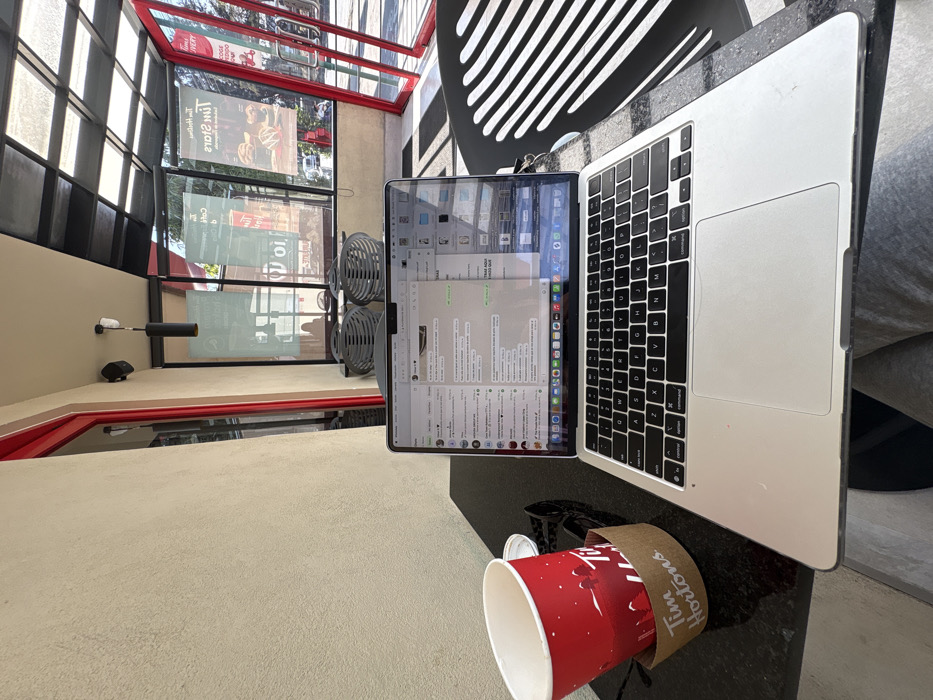 An overhead view shows a laptop and tablet displaying messages on a black table next to a red and white Tim Hortons coffee cup. The background features a red-framed glass structure reflecting the exterior. Metal fan fixtures adorn the wall. The table sits on a neutral-toned floor.