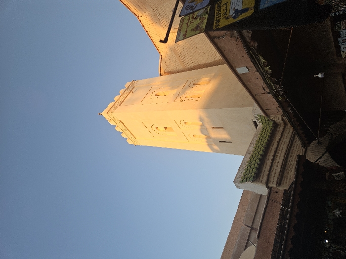 - "The upward shot captures a minaret's sandstone facade against a clear blue sky, with sunlight casting shadows" by FM-iikl52, licensed under CC BY 4.0