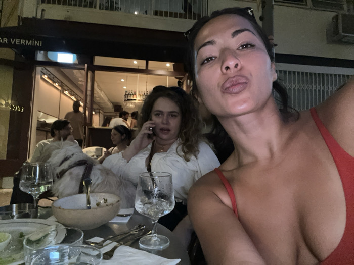The image captures an outdoor dining scene at night, specifically at Bar Vermini, located at Ben Yehuda Street 138, Tel Aviv-Yafo, Israel. In the immediate foreground, on the right, a woman with dark hair pulled back and a tanned complexion, wearing a red spaghetti-strap top, is taking a selfie, making a "kissing" face with pursed lips. To her left, seated at the same table, a woman with curly brown hair, dressed in a white blouse, is engaged in a phone call, holding a dark smartphone to her right ear. A white, fluffy dog wearing a harness is seated on a chair at the table between the two women and the restaurant interior, appearing to look towards the establishment. The dark-colored table is set with multiple clear glasses, some containing ice and liquid. A ceramic bowl with food remnants and a spoon, a small white plate with remnants, and a small bowl holding lime wedges are present. Cutlery is arranged on white napkins. Through the open entrance of Bar Vermini in the background, several patrons are visible inside the brightly lit interior. One man in a light-colored shirt is standing near the bar area. The bar features bottles displayed on shelves. The establishment's name, "BAR VERMINI," is visible on a dark awning above the entrance. The scene is illuminated by artificial light, indicating nighttime.