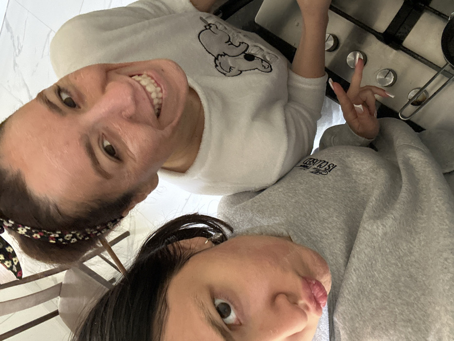 The image depicts an indoor, residential scene, likely a kitchen, located in Yerevan, Armenia. Two females are positioned in a close-up, high-angle selfie. The female on the left, appearing younger, has dark hair and wears a light grey long-sleeved top with partial text "IS CLOSED" visible on the chest. She is looking directly at the camera with a "duck face" or pout expression. Her right hand is visible, forming a "peace sign" gesture, with long fingernails tipped in white. Her facial skin exhibits an uneven texture, consistent with a topical application. The female on the right, appearing older, has dark hair secured with a patterned headband featuring small floral elements. She wears a white, fluffy long-sleeved top with a grey koala embroidered on the left chest. She is smiling broadly, displaying her teeth, and looking towards the camera. Her face also shows an uneven texture, possibly from a topical application. In the background, a light-colored tiled surface is visible. A portion of a wooden chair is present in the upper left. In the lower right, a stainless steel gas hob with four burners and control knobs is visible, along with a partial metal pot handle, indicating a kitchen setting. Both individuals are posing for the camera, with the younger female making a playful expression and hand gesture, while the older female smiles.