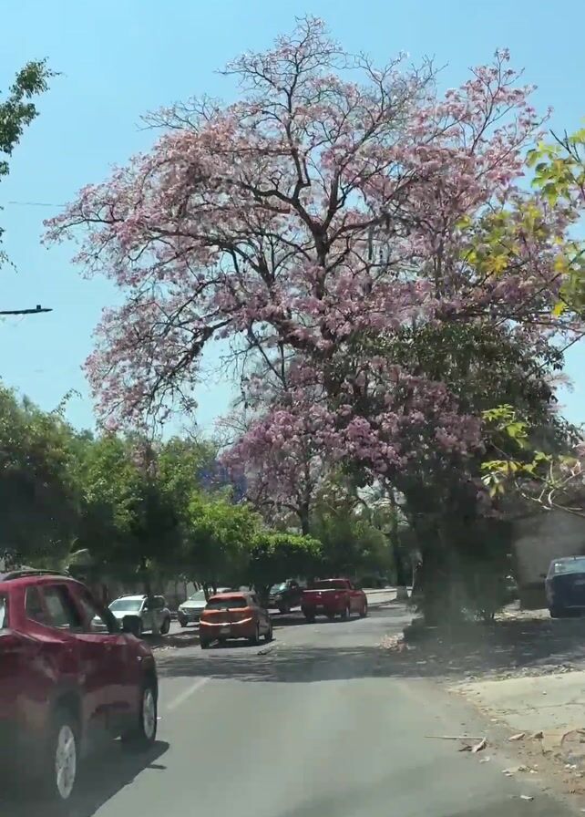 The view from inside a moving car captures a street lined with trees in full bloom with pink flowers against a clear blue sky