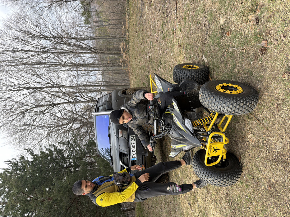 - "In a forested clearing near the city of Kladnitsa, Bulgaria, an adult male stands beside a child seated on a quad bike" by FM-rHl0I2, licensed under CC BY 4.0