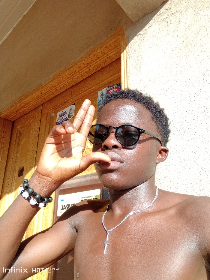 The scene is situated outdoors in Rido, Nigeria, against a building facade under bright, direct sunlight. A single young individual with dark skin and short, dark curly hair is depicted from the chest up. The person is bare-chested, wearing dark, round sunglasses, a silver-colored chain necklace with a pointed cross pendant, and a black and white beaded bracelet on the left wrist. The individual's right hand is raised to their face, with the thumb and index finger touching the chin/lower lip area, and the middle and ring fingers extended upwards. The person gazes slightly upwards and to their left. The background features a light brown, carved wooden doorframe on the left and a textured, light-colored wall on the right. Several stickers are visible on the background surfaces, one appearing to show a face with text including "PROUD MEMBE" and another partially visible as "SOS". The image metadata indicates it was captured with an "Infinix HOT 2 PLAY" device.