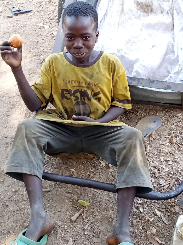 A young Black male, appearing approximately 8-12 years old, sits on a black metal bar or frame on a dirt ground in Zango-ndaji, Nigeria