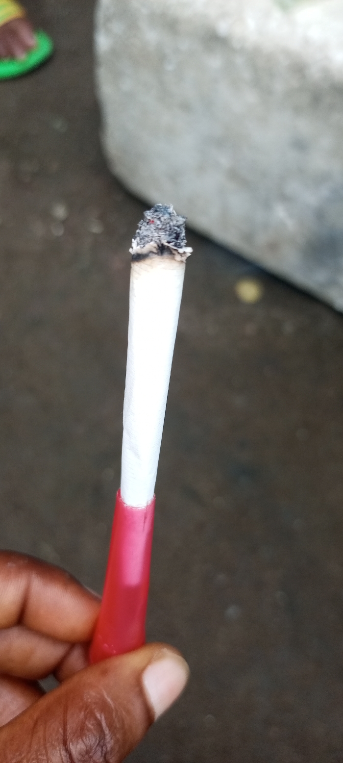 A dark-skinned hand holds a lit, hand-rolled smoking article by its bright red, tubular mouthpiece. The white paper of the article tapers slightly towards its tip, which displays a glowing red ember and substantial grey ash. In the blurred background, a dark ground surface is visible. A green object, possibly footwear, is partially visible in the upper left. A large, light-grey, rough-textured object, likely concrete or stone, occupies the right side of the background. This scene is located in the city of Adankolo, Nigeria.