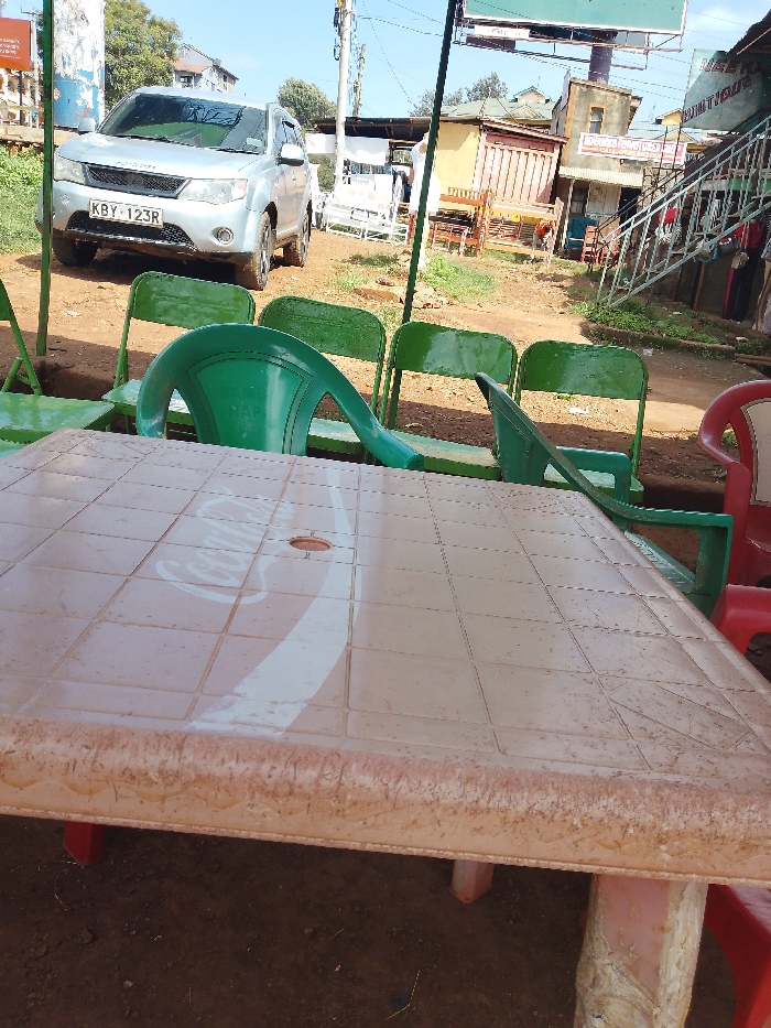 square, brown, plastic table with a white Coca-Cola logo on its surface. The table is sitting on a patch of brown dirt and grass, and is surrounded by green plastic chairs. The chairs are arranged in a row, and the table is positioned in front of them. The table is in a small, open-air outdoor area. A silver SUV is parked to the left of the table, partially visible in the image. The car is a Mitsubishi Outlander with a license plate number KBY 123R. The background of the image shows a number of buildings, including one with a sign that reads "Welcome." The location of the scene is a small business or restaurant in Ruaka, Kenya, at latitude -1.207, longitude 36.783. The environment is dry and dusty, with some vegetation in the background. There are no people in the scene.