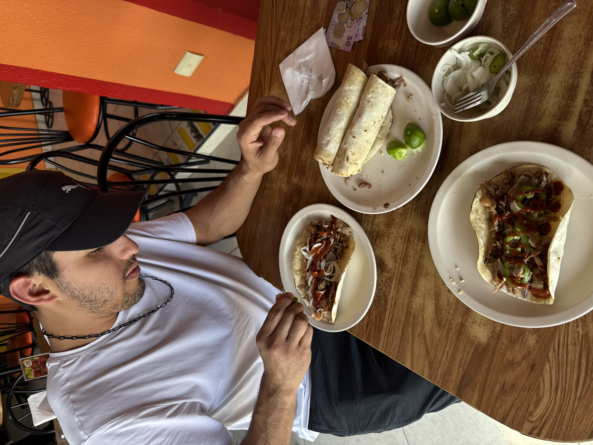 The scene depicts a male individual dining at a casual restaurant or eatery in the city of Puebla, Mexico. The man, visible from the chest up, has dark hair, a beard, and wears a white short-sleeved t-shirt with a black chain necklace. He is also wearing a black baseball cap with a white Puma logo. His attention is directed downwards towards the food, and his right hand is seen squeezing a lime wedge over one of the dishes. The polished wooden table is laden with multiple plates of food. In the foreground, two white plates hold open tacos. One taco is filled with shredded meat, sliced white onions, and topped with both red and green sauces. The second taco also contains meat, onions, red and green sauces, and visible green jalapeño slices. A third white plate contains two rolled items, possibly burritos or flautas, alongside two lime wedges and residual food particles. Adjacent to the rolled items, a crumpled white paper napkin and Mexican currency (a 50-peso banknote and several coins) are present on the table. Two small white bowls complete the table setting: one contains sliced white onions and green jalapeño slices with a silver fork inserted, and the other holds additional lime wedges. The background reveals a brightly lit interior with black metal chairs featuring orange circular seats. The walls are distinctly painted in sections of bright orange and red. A white electrical switch or outlet cover is mounted on the orange wall. The floor appears to be light-colored tile with a yellow striped pattern visible beneath the chairs.