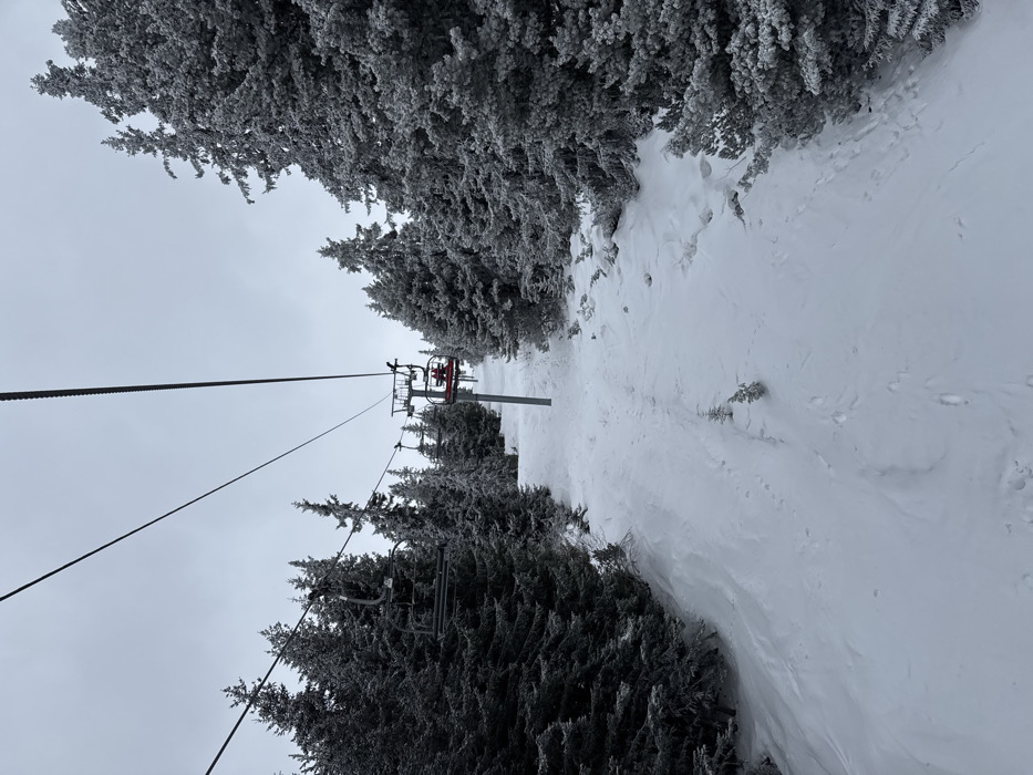 This image presents a winter scene from a ski chairlift ascending a snow-covered mountain slope, located in the vicinity of Samokov, Bulgaria