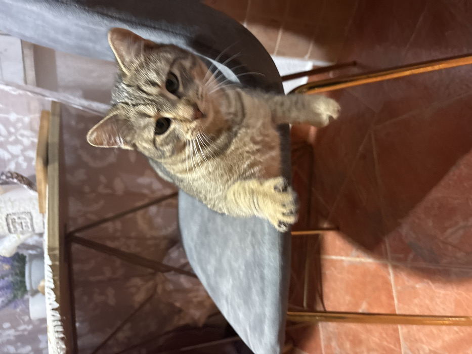 A tabby cat with green eyes perches atop a gray chair. It looks upward towards the camera, its front paws extending slightly over the chair's edge. The chair has gold legs and sits on a floor tiled with reddish-brown squares. A side table with white and purple decorations is visible to the side of the chair.