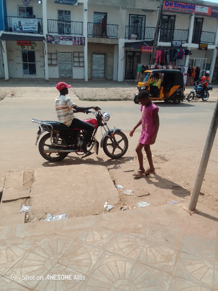 This image depicts a daytime street scene in Awka, Nigeria. In the foreground, a paved sidewalk with a decorative circular pattern transitions into a dirt and gravel shoulder containing scattered white plastic litter. A grey metallic pole is partially visible on the right. A male individual, wearing a red baseball cap, a striped t-shirt (white, orange, dark stripes), dark trousers, and dark shoes, is seated on a red motorcycle with black and chrome components. His hands are on the handlebars, and he is positioned on the dirt shoulder facing left. To his right and slightly forward, a young female, wearing a short-sleeved pink dress and light-colored flip-flops, walks on the dirt shoulder, casting a shadow. In the midground, a paved road stretches horizontally. A yellow auto-rickshaw (Keke Napep) with a black canopy is visible on the right side of the road, moving away from the viewer with at least two occupants. Behind it, a blue motorcycle with a rider in an orange shirt is also present. Across the road, a row of multi-story commercial buildings lines the street. The ground floors feature various storefronts, some with closed metallic shutters, others open with merchandise, including clothing, displayed outside. Visible signage includes "De Emerald ELECTRONICS & INTERIOR" and "DESTINY SEXY WEARS." The upper floors have balconies with black metal railings. A person in a red shirt is observed on a balcony of the leftmost building. The background shows a clear blue sky. The scene is illuminated by direct sunlight, indicated by distinct shadows.