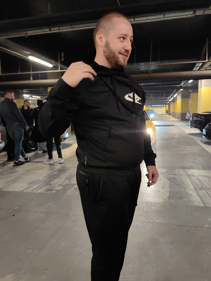 The image depicts an underground parking garage in Sofia, Bulgaria, featuring a male subject in the foreground and a group of individuals and vehicles in the background. The central figure is a light-skinned male, appearing to be in his late 20s to early 30s, with a short beard and short hair. He is wearing a black hooded sweatshirt with a white Nike logo on the upper right chest/shoulder and "DRI-FIT" text on the left side of the torso. He is also wearing black athletic pants with a zippered pocket on the left thigh, also marked "DRI-FIT." He is positioned from the waist up, facing towards the right of the frame, with his head slightly turned upwards and to the right, exhibiting a subtle smile. His right hand is raised, with fingers on his left shoulder, possibly adjusting his hoodie. His left hand is down by his side, holding a small dark object. In the blurred background on the left, several other individuals are visible, standing in small groups near parked vehicles. One person on the far left is wearing blue jeans and a dark top. In the mid-ground, a yellow vehicle with illuminated headlights is prominent, parked or moving slowly. Further in the background, along the right wall, several dark-colored vehicles are parked. The environment consists of a concrete floor with visible tire marks and light debris. The ceiling is low, exposing pipes, conduits, and fluorescent strip lighting fixtures. Yellow structural pillars are visible on the right side of the frame, characteristic of a commercial parking facility. The lighting is entirely artificial.
