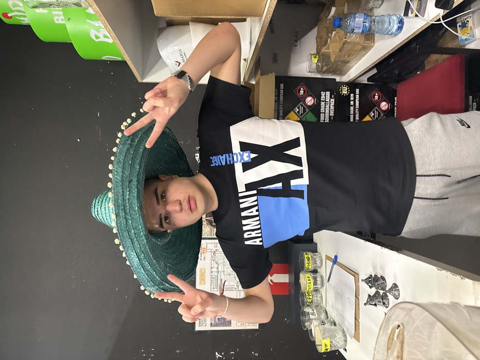 An indoor scene depicts a young male, likely in his late teens or early twenties, standing within a storage or utility area of a commercial establishment in Plovdiv, Bulgaria. He is centrally positioned, facing the viewer, wearing a large, teal-colored straw sombrero decorated with light-colored spherical embellishments. Both hands are raised, forming peace signs with palms forward. He is dressed in a black t-shirt featuring a prominent "ARMANI AX" logo in black, blue, and white, and light grey Nike sweatpants. A silver-toned wristwatch with a black band is visible on his left wrist. To the subject's left, a white countertop holds several clear glass tumblers, some bearing handwritten Cyrillic labels such as "ЕРИТАЯ", "АННА", and "МАЯ". A sheet of paper on a clipboard with a blue pen rests on the counter, adjacent to a cluster of small, metallic, conical objects. A large, white, cylindrical object is partially visible on the far left. The background wall is dark, displaying a schematic diagram titled "СХЕМА" and "112", and a red fire extinguisher symbol is partially obscured further back. To the subject's right, a light-colored wooden shelving unit is visible. The top shelf contains several light green cylindrical items, some labeled "BIZAR", and a white bucket with the text "MARIA ISLAND". The lower shelf holds multiple cardboard boxes, explicitly labeled "FOOD GRADE E942 SOVRIMBALLAGGIO OVERPACK" and "NITROUS OXIDE, UN 1070," alongside warning pictograms, including an 18+ restriction. A clear plastic water bottle with a blue cap and additional empty glassware are also on this shelf. A red cushion or fabric item rests on the floor below the shelving unit.