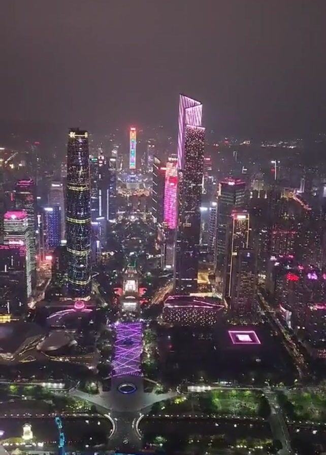 nighttime cityscape with numerous skyscrapers illuminated with various colors. The camera appears to be positioned at a high vantage point, overlooking a city center with roads, parks, and other urban infrastructure. The sky is overcast or hazy, muting the colors and adding to the atmospheric perspective. The buildings are lit with an array of colors including pink, red, blue, and white, creating a vibrant urban landscape. The overall scene is one of a modern, bustling metropolis at night.