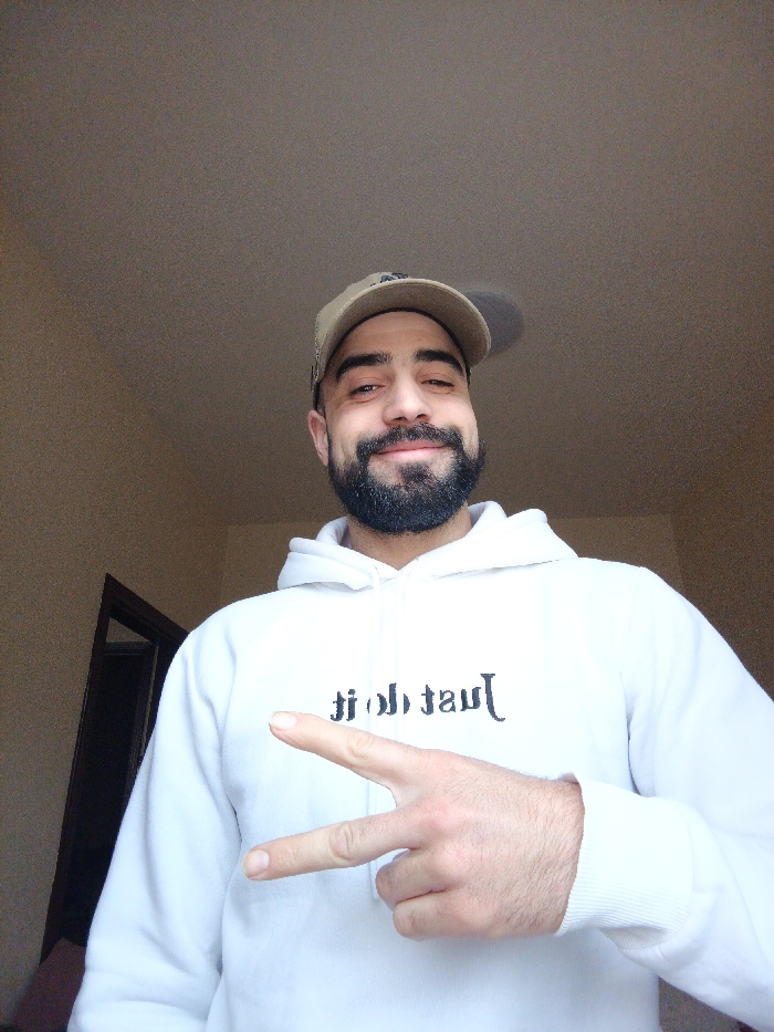 A male subject is depicted in a close-up, low-angle indoor portrait. He is an adult with dark hair, a dark, full beard, and a mustache, exhibiting a smiling expression. He wears a light-colored (tan/beige) baseball cap, angled slightly to his right, and a white hooded sweatshirt with the mirrored text "Just do it" printed in black across the chest. His right hand is raised to chest level, forming a "peace sign" gesture with the index and middle fingers extended. The background consists of plain, light-colored walls, with a dark-colored door frame visible on the left side of the frame. The lighting is even, suggesting an illuminated interior space. The specific location within the city of Meknes, Morocco, is not discernable from the generic indoor setting presented.