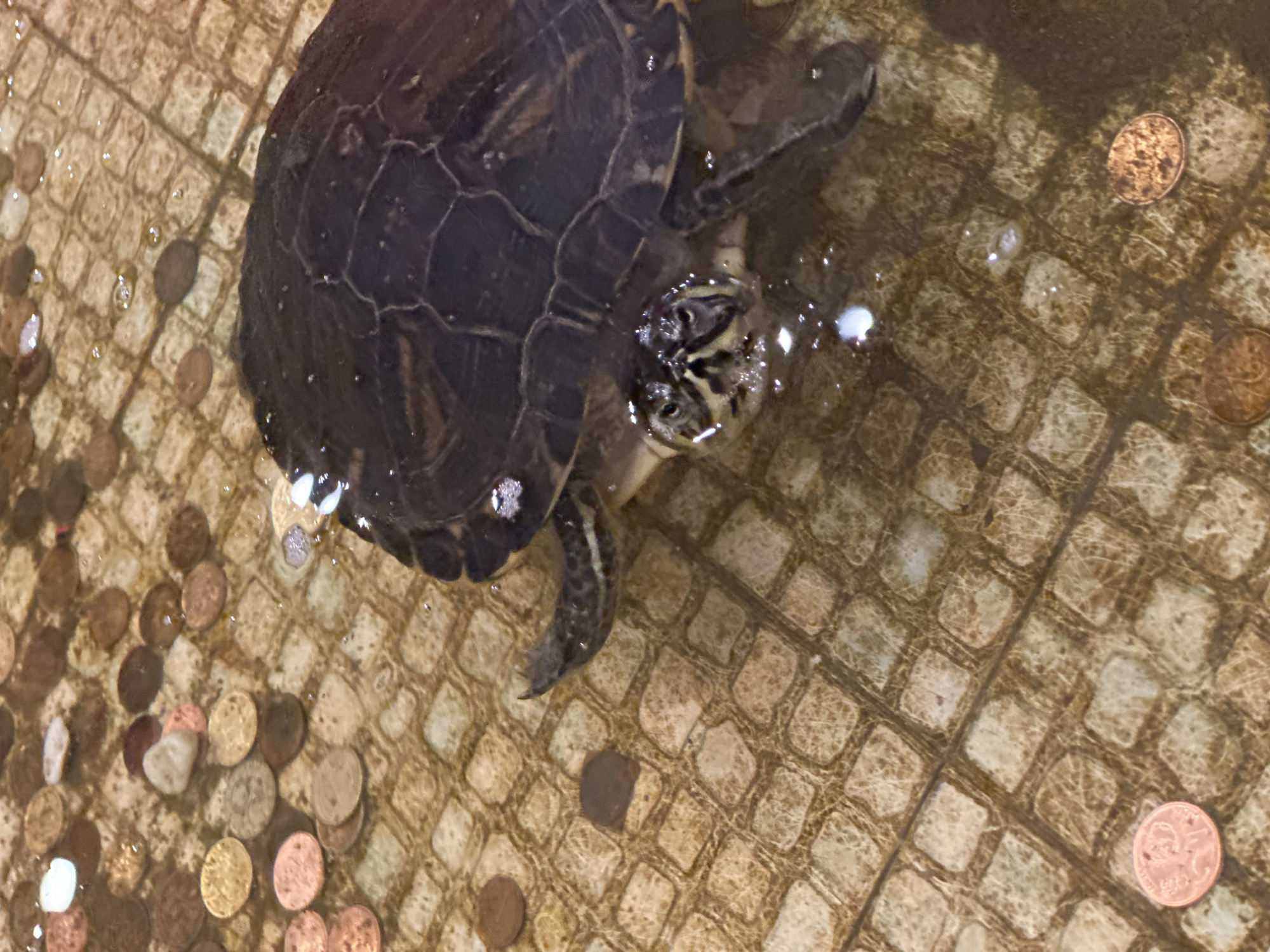 A single turtle is depicted from an overhead perspective, partially submerged in clear, shallow water. The turtle features a dark, segmented carapace, and its head, with visible eyes, protrudes above the waterline, accompanied by small surface bubbles. Its anterior limbs are partially visible. The basin's floor is constructed from light-toned, square-patterned tiles, resembling cobblestones. Scattered across this tiled bottom, beneath the water, are numerous metallic coins of varying sizes and colors, predominantly copper and lighter metallic hues. The scene is located in Sofia, Bulgaria.