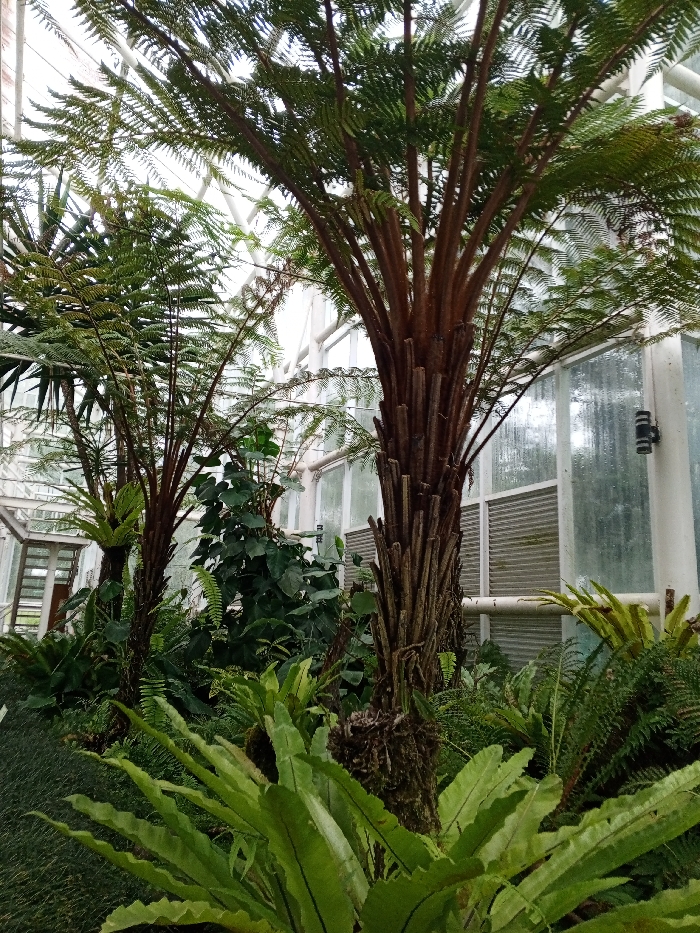 Inside a glass structure, possibly a greenhouse, a vibrant display of greenery thrives. Two prominent tree ferns with slender brown trunks and delicate, feathery fronds dominate the scene. Lush ferns with broad, bright green leaves fill the foreground. Other plant varieties, including vines and smaller ferns, contribute to the dense undergrowth. The glass panes of the structure are visible in the background, and some show signs of moisture, suggesting a humid environment.