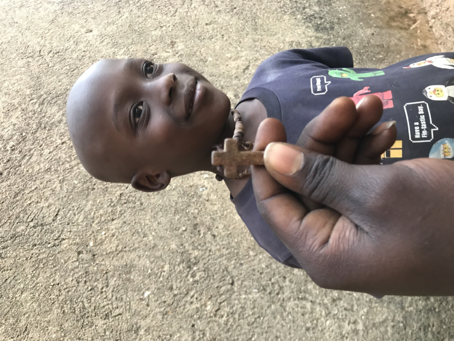 A young child wearing a beaded necklace with a cross is seen from a slightly elevated perspective