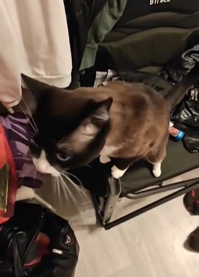 brown and white cat standing on a folding chair. The chair is dark green and has a black logo that says "Strace" on the back. The cat has a white nose and white paws. The cat is looking up at the person filming, and the person asks, "What are you?" The cat then jumps down from the chair and walks away. The floor is light-colored. There is a pile of clothing next to the chair and a black bag in the corner. There are socks and a treat tube on the chair. The person filming is wearing black sneakers.