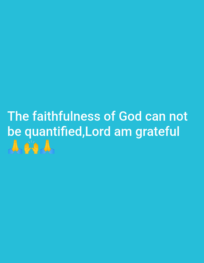 A blue background displays the text "The faithfulness of God can not be quantified, Lord am grateful." Below the text are emoji images: hands pressed together in prayer, two hands raised in celebration, and hands pressed together in prayer. The visual message expresses gratitude to God.