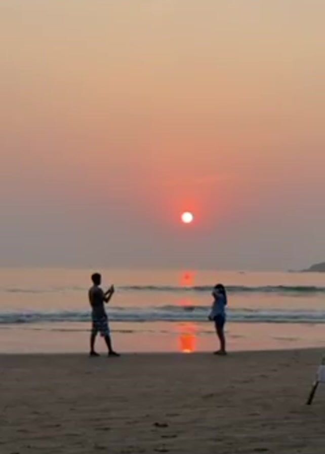 beach scene at sunset. A man in swim trunks is standing on the sand, facing the ocean, holding a phone up as if taking a picture or video. A woman in a light blue shirt and dark pants is standing a few feet away, also facing the ocean, with her arms crossed. The sun is setting over the water, creating a bright orange glow on the horizon and reflecting on the ocean surface. There is a small structure of some kind on the right side of the frame. The sky is a gradient of colors from orange to light pink. Waves are gently lapping at the shore.