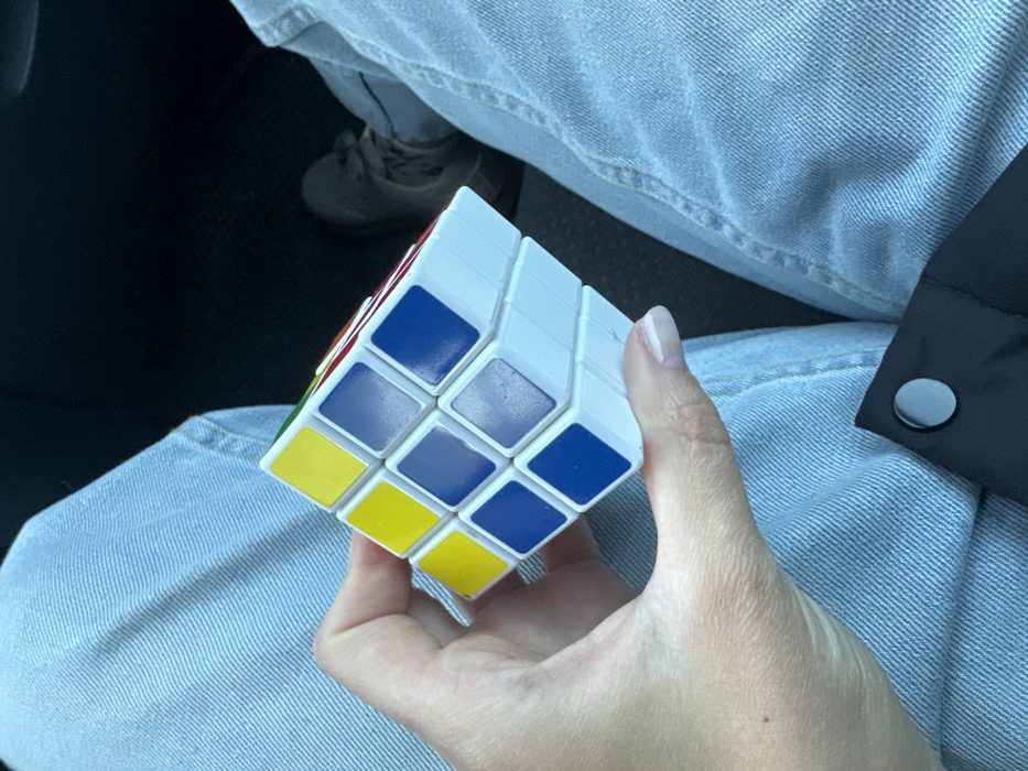 An overhead-angle image depicts the partial view of an individual's lower body within what appears to be a vehicle interior. The person's upper legs are visible, clothed in light blue denim jeans. A left hand, featuring manicured nails with a light tip, holds a 3x3x3 Rubik's Cube. The cube's visible faces display a combination of yellow, blue, and light purplish-blue squares, indicating a partially solved or scrambled state. A dark-colored garment, possibly a jacket or bag, with a metallic snap button, is visible in the lower left foreground. In the background on the right, a light beige/grey athletic shoe is visible on a dark, indistinct surface consistent with a vehicle's floor. The specific location within the city of Chaikovsky, Russia, cannot be determined from the visual evidence in the image.