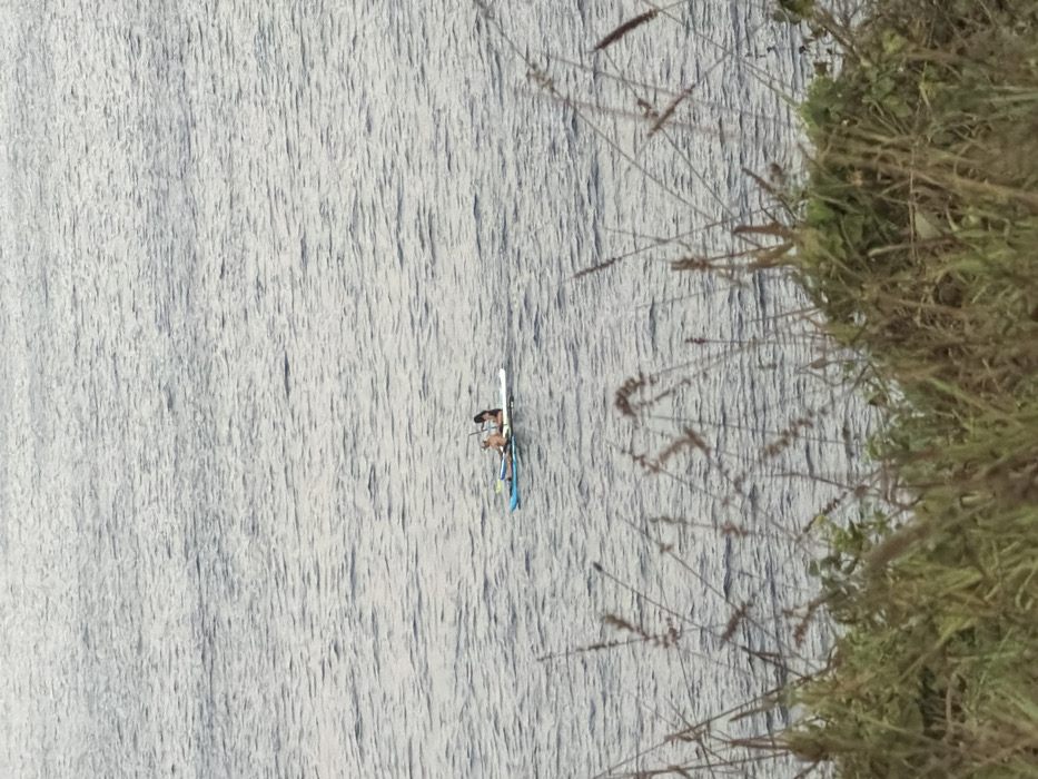 A body of water occupies the majority of the scene, its surface rippled with subtle waves. A person is water skiing in the center of the frame, and they are pulled by something out of frame. Overhanging grass and brush are located in the upper right corner, partially obscuring the view. The color palette is dominated by muted blues, greens, and tans, giving the scene a peaceful, natural feel.