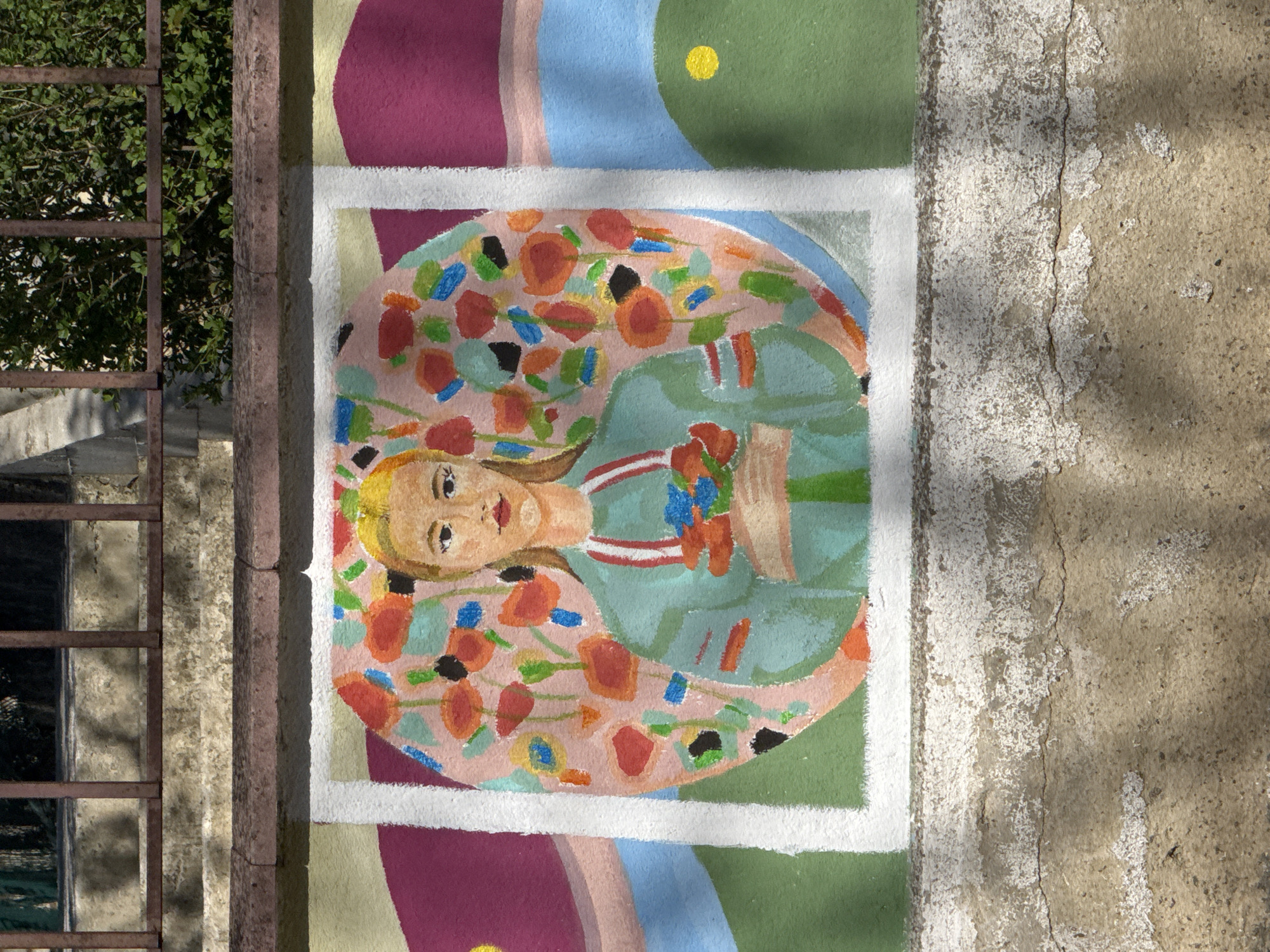 The image depicts a ground-level, abstract mural in Dobrich, Bulgaria. The mural is composed of geometric shapes in pink, light blue, yellow, and green, surrounding a central, white-bordered square. Within the square is a circular painting of a woman with fair skin and blonde hair, wearing a blue dress and holding flowers. The woman is surrounded by a pink background with stylized flowers. The mural is situated next to a concrete ledge and an old metal railing, with foliage visible beyond. The surface of the concrete surrounding the mural is weathered and cracked.