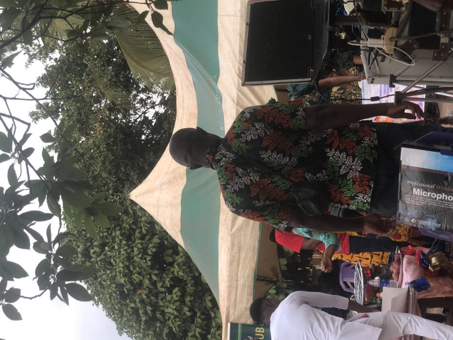 The scene is set outdoors in Awka Etiti, Nigeria. An adult male is prominently featured in the foreground, viewed from the back. He is bald and wears a black, short-sleeved collared shirt with a repeating pattern of green and orange/red leaves. A black pouch is slung across his back. He stands in front of a large canopy tent, which is cream or off-white with a green stripe. The tent's pointed peak is visible in the upper mid-ground. To the left of the main subject, a person dressed in a white long-sleeved garment stands near a table laden with items. These items include several bottles, a small charcoal grill, and a tray holding what appear to be food items, possibly plantains. A white box is also on this table. Further left, dense green foliage is visible. To the right of the main subject, an open black HP laptop is positioned on a stand or table. Adjacent to the laptop, a white power strip or multi-socket charger is connected to several cables. Below the laptop setup, a cardboard box labeled "Professional Wireless Microphone" is partially visible. Additional individuals are partially visible in the mid-ground behind the tables and equipment, some wearing patterned clothing or a red top. The background consists of dense green trees and foliage under an overcast sky.