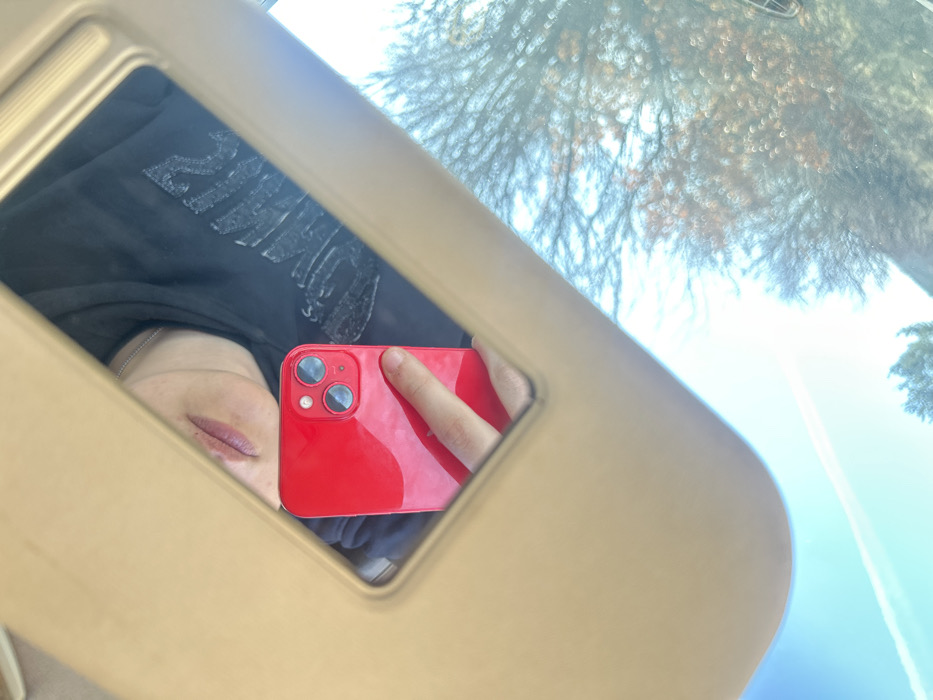 The scene depicts a selfie taken from inside a vehicle, specifically capturing a reflection in a beige sun visor mirror