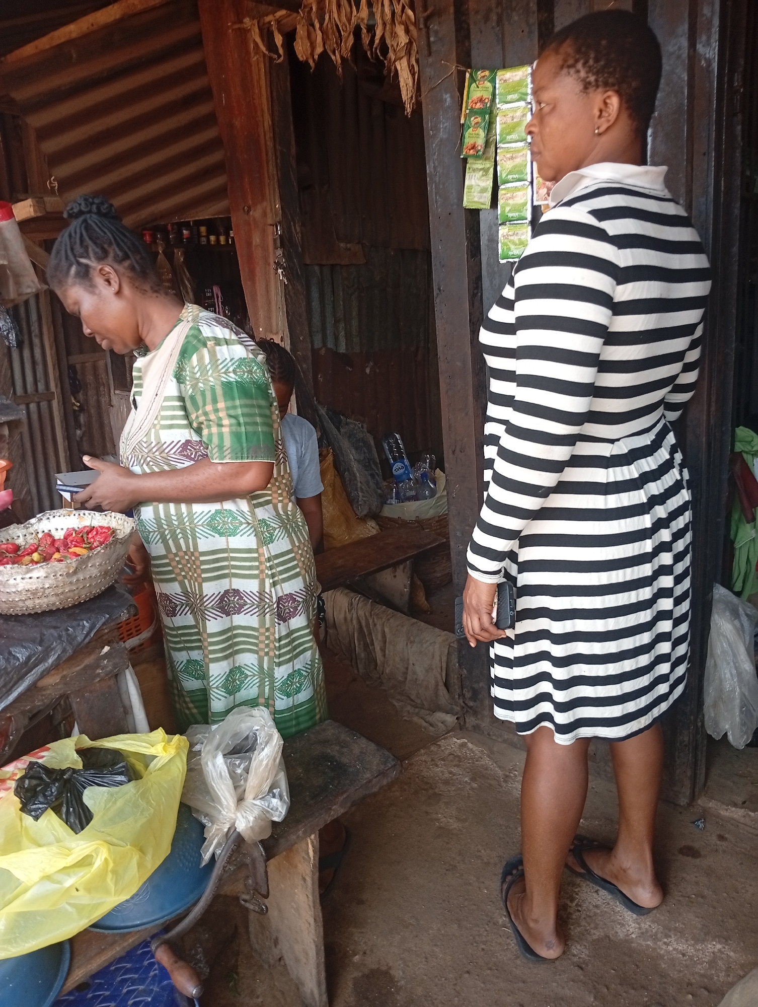 Two women are present in an outdoor market setting in Owerri, Nigeria. One woman, dressed in a green and white patterned dress, is looking down at a basket of red chilies. She appears to be examining or counting the chilies. In front of her are yellow and clear plastic bags. The second woman is wearing a black and white striped dress and is standing near the door. She has a phone in her right hand and is looking away from the camera. The market is in a semi-enclosed structure, with wooden posts and corrugated metal visible. There are some items hanging from the roof and shelves on the side. The ground is concrete. Packets of goods are attached to the side. A man wearing a blue shirt is in the background.