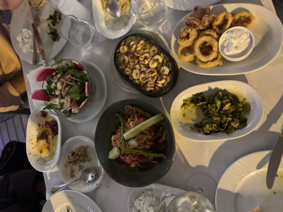 A white-clad dining table in a restaurant in Istanbul, Turkey, is depicted, illuminated by artificial light creating distinct shadows. Two individuals are partially visible at the top, indicated by their torsos and arms. The table is laden with numerous dishes and glassware, suggesting an active meal. **Key objects and subjects include:** * **Center-left:** A dark bowl containing a noodle or pasta-like dish, garnished with sliced cucumber and green peppers. * **Center:** An oval, dark-colored sizzling plate holding cooked shrimp and possibly squid/octopus rings, interspersed with green vegetables. * **Right-center:** An oval white plate piled with golden-brown fried calamari rings and additional fried seafood, accompanied by a small white ramekin of dipping sauce. * **Upper-center:** A clear glass bowl filled with a green salad, featuring lettuce, sliced radishes, and other mixed ingredients. * **Lower-center:** An oval white dish containing cooked green leafy vegetables. * **Scattered small white plates:** Several small plates display remnants of various meze dishes, including a red-hued paste or dip, a granular brown substance, and a creamy white spread. * **Glassware:** Multiple water glasses, one empty wine glass on the far left, and a tall, narrow glass containing a cloudy white liquid (likely Raki) on the far right. * **Cutlery:** Forks, spoons, and knives are present on or near the plates, some showing signs of use. Consumption of food is evident from the partially eaten contents of several dishes. The overall scene indicates a traditional Turkish meze and seafood dining experience.
