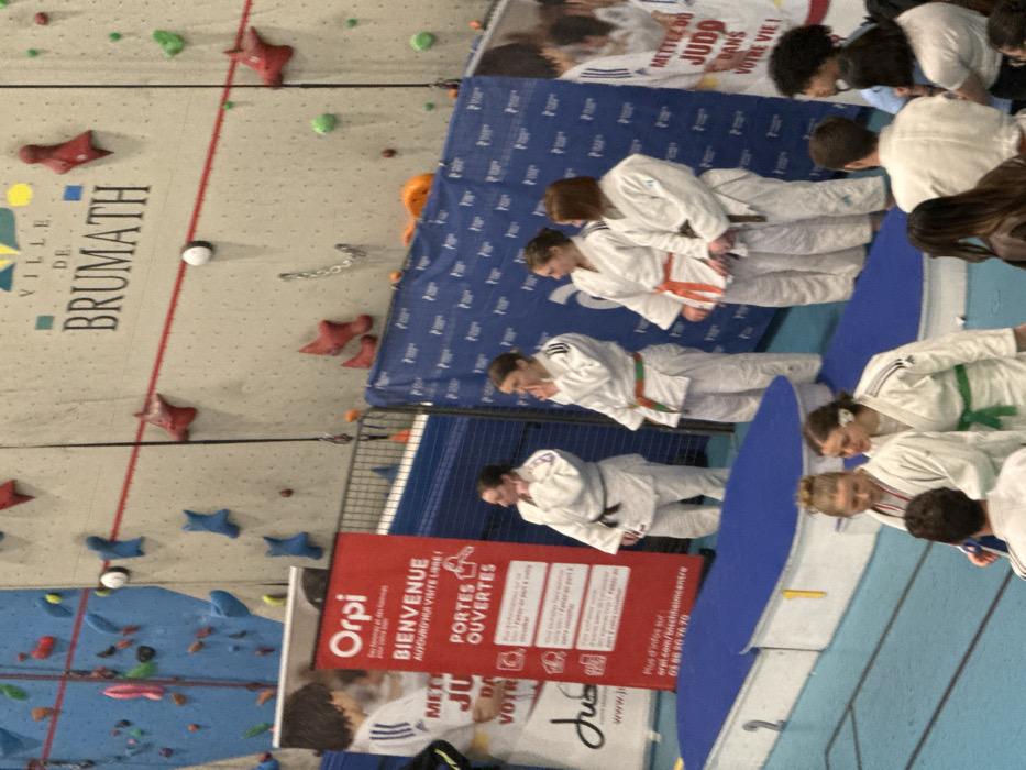 The image depicts an indoor sports facility located in Brumath, France, identified by a "VILLE DE BRUMATH" sign on a climbing wall in the background. The scene features a judo event or award ceremony. In the foreground and mid-ground, a three-tiered podium, colored blue and white, is positioned, with numbers '1', '2', and '3' visible on its steps. To the right of the podium, four young adult females stand in white judogi (judo uniforms). One wears a brown belt, one an orange belt, and one a green belt; the fourth has a white belt. The female with the orange belt has her right hand raised near her mouth. Another female, in a white judogi, has her left hand positioned near her neck. Below the podium, several other individuals, some also in judogi, are partially visible, observing the scene. The background consists of a tall, textured climbing wall equipped with numerous multi-colored climbing holds in shades of blue, red, green, yellow, and pink. A metal chain hangs from this wall. Adjacent to the podium, a prominent red vertical banner for "Orpi" advertises "BIENVENUE" (Welcome) and "PORTES OUVERTES" (Open Doors), listing contact information for "orat.com/bischheimcentre" and a phone number. Further right, a blue banner with repetitive white logos is visible, partially obscuring the base of the climbing wall. A white banner on the far right is partially visible, displaying "METTEZ DU JUDO DANS VOTRE VIE!" (Put Judo in your life!). The floor is a light blue sports surface.