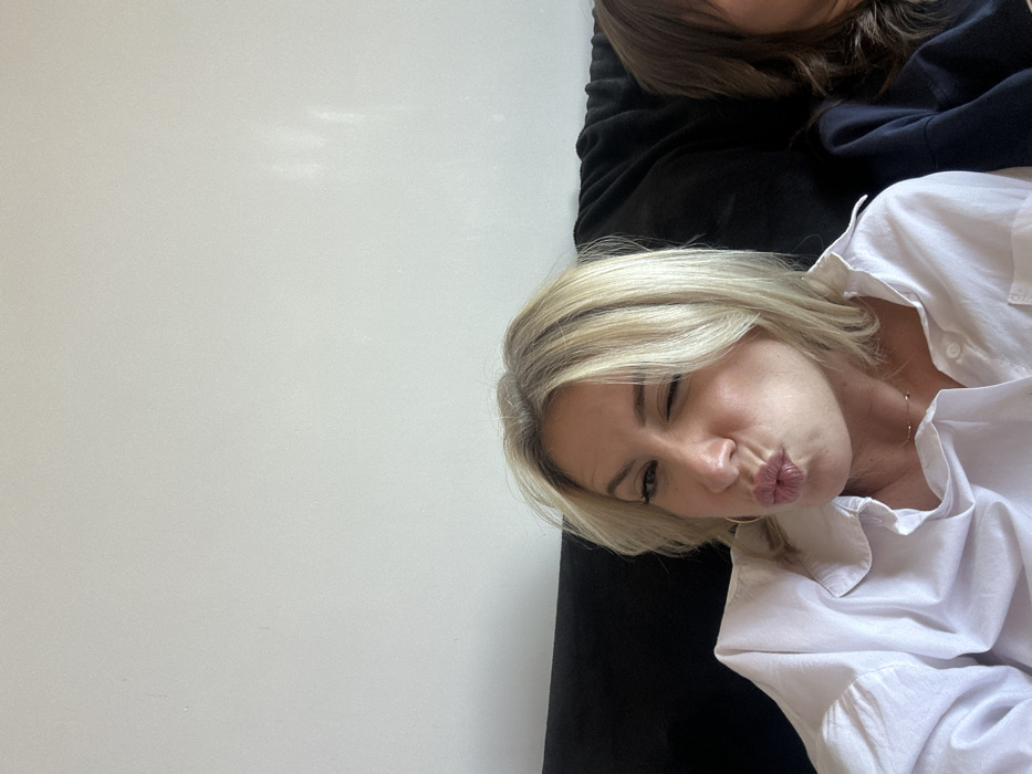 This indoor image features two individuals. In the left and central foreground, an adult female with shoulder-length blonde hair is depicted. She wears a white collared shirt, gold-colored hoop earrings, and a delicate necklace. She winks with her right eye and puckers her lips, looking directly at the camera. To her right, a second individual is partially visible, showing brown hair and dark-colored clothing. Both are seated on a dark, upholstered surface, likely a sofa. A plain white wall forms the background. The specific location within the city of Cannes, France, or any other city, cannot be ascertained from the visual evidence.