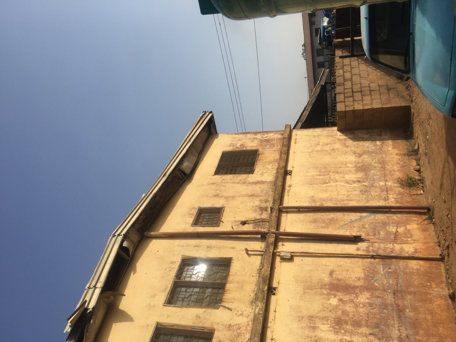 A low-angle shot reveals a weathered, yellow building under a clear blue sky. Visible are several barred windows, some reflecting sunlight, and rusty pipes running along the exterior wall. The roofline features a worn gutter. Adjacent to the building is a rough, brick structure and the edge of a blue car. The image also captures overhead wires and a water tank in the upper portion of the frame.