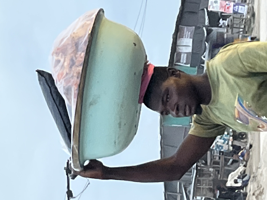 An adult male stands outdoors in Ado, Nigeria, carrying a large light-blue basin on his head, supported by his raised right arm