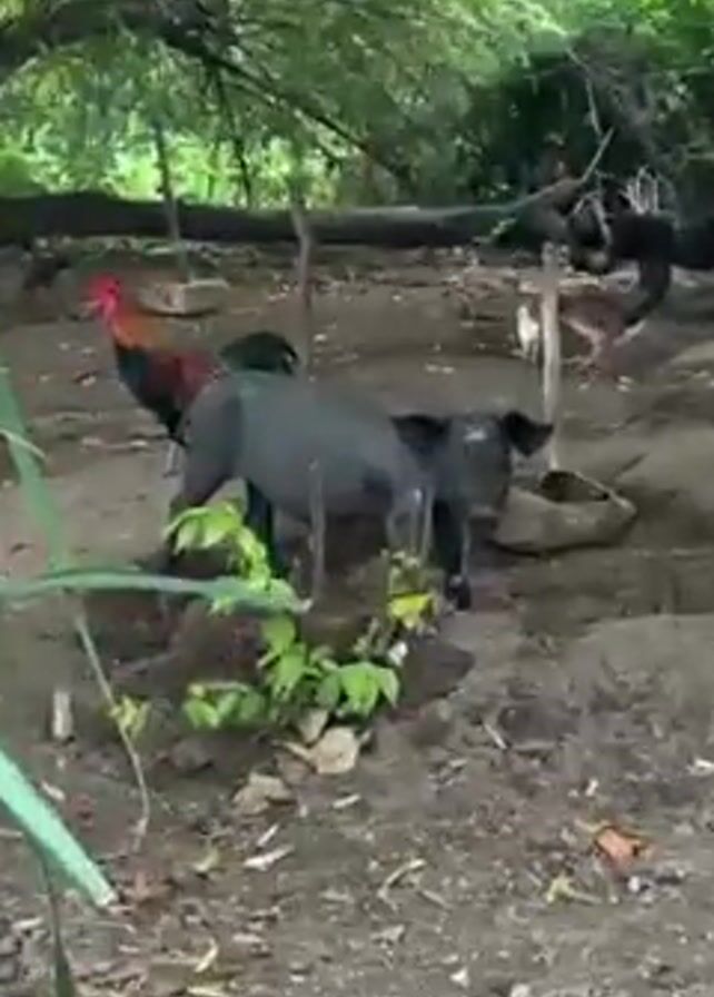 rural area with several black pigs, chickens, and greenery. At the beginning of the video, one of the black pigs stands out in the foreground. The camera then pans to reveal more pigs, along with chickens, in a partially shaded area with trees. A structure is also visible in the background. One of the pigs appears to be wearing a harness. The ground is mostly dirt and scattered debris.