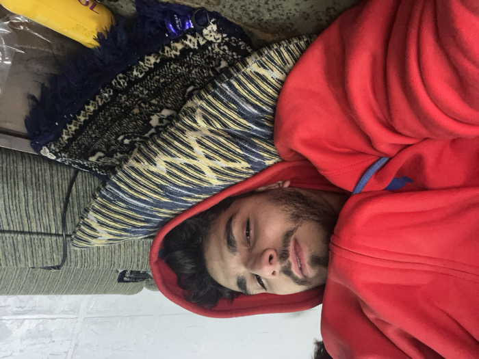 A person wearing a red hooded sweatshirt lies on a surface. Near the top-left corner, a yellow container is partially visible. A blue and cream patterned blanket rests beside the individual. The background includes a couch and white tiled floor. The individual is facing upwards, with their head tilted to the side.