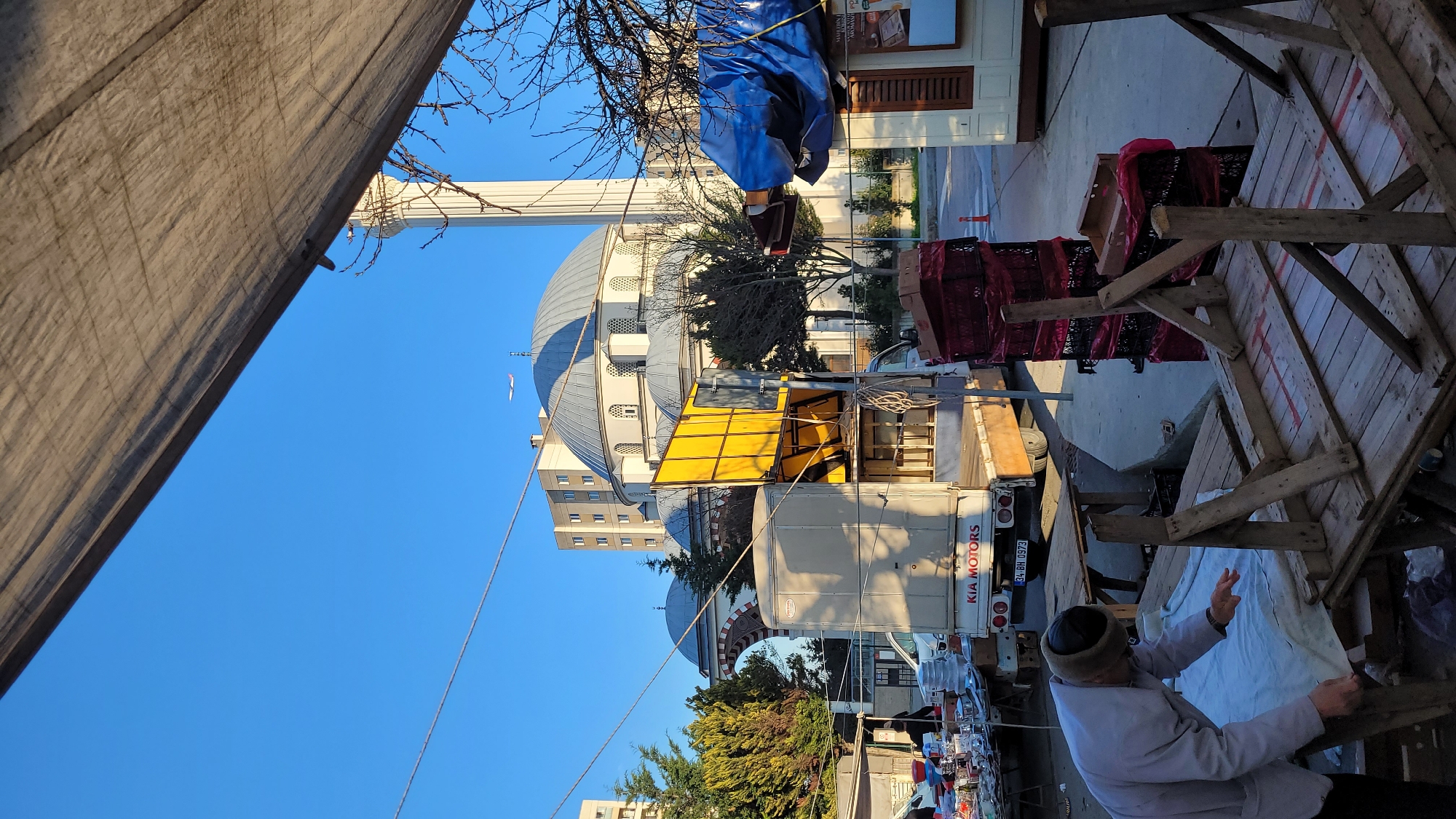 The image depicts a street scene in Beylikdüzü, Turkey, under a clear blue sky. A large mosque with multiple domes and a tall minaret is visible in the background. A white KIA Motors truck is parked on the street, partially obscured by trees. A wooden structure, possibly a market stall, occupies the foreground. A man wearing a light-colored jacket and a dark hat is standing near the stall, appearing to be arranging items on it. The overall scene suggests a marketplace or street vendor setting up for business.