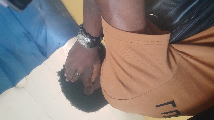 An obliquely angled indoor photograph, captured in Ihiagwa, Nigeria, features a person viewed from behind and to their right. The individual, displaying dark, curly hair, obscures their face with their left hand. A silver-colored ring is visible on the left ring finger. The person wears an orange-brown short-sleeved shirt with black lettering, possibly "UJ," visible in reverse on the left side. The right arm is extended, revealing a silver-colored wristwatch with a black band and a black beaded bracelet on the wrist. A black bag or strap with a zipper is partially visible on the lower right. The background consists of white ceiling tiles in the upper left, a large section of blue fabric or tarp in the upper and mid-right, and a yellow-colored surface beneath the blue material.